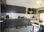 Im Eingangsbereich liegt das Gäste-WC mit Fenster. Dem Flur folgend (hier ist Platz für eine Garderobe), ist zur Rechten die große Küche mit positioniert. Eine Einbauküche ist bereits verbaut und im Preis enthalten. Die Küche ist sehr groß und bietet daher Platz für eine Essecke. Ein Holzofen mit Kochmöglichkeit (!) rundet die Räumlichkeit ab – eine absolute Besonderheit mit Seltenheitswert!
