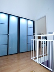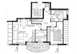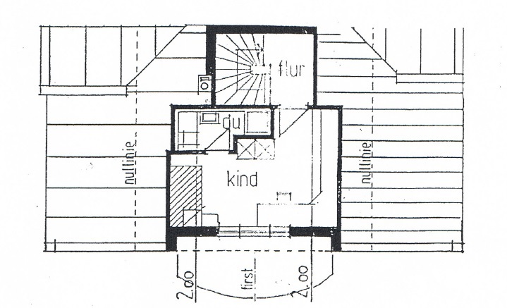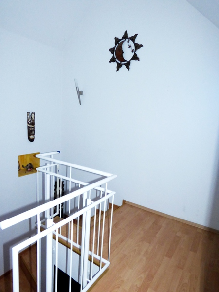 Die zweite Ebene der Wohnung wird über eine innenliegende Treppe erreicht. Die Schräge in der kleinen oberen Diele kann praktisch genutzt werden, indem hier ein Einbauschrank positioniert wird.