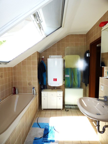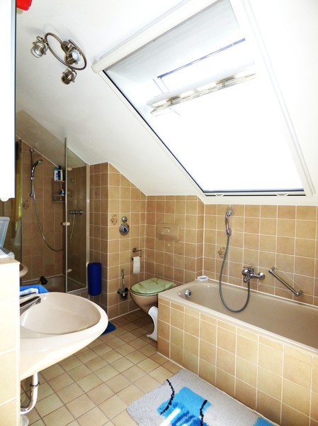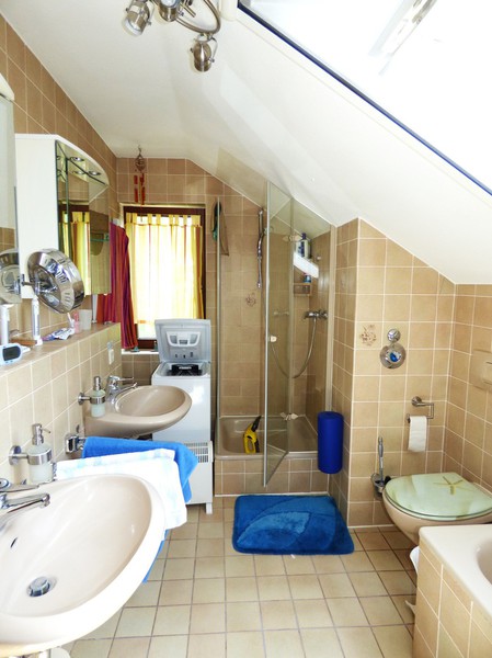 Das Tageslichtbad (2 Fenster!) ist mit einer Dusche, Badewanne, 2 Waschbecken und einer Toilette ausgestattet. Ein Gäste-WC ist zusätzlich vorhanden. Ihre Wäsche können Sie bequem in der Wohnung erledigen, denn das Bad ist mit einem Waschmaschinenanschluss ausgestattet. Alternativ kann die Wäsche auch im Keller erledigt werden, hier ist nämlich ein großer Wasch- und Trockenraum vorhanden.