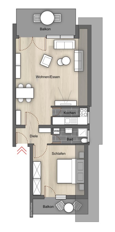 Die Raumaufteilung sieht wie folgt aus: Die Wohnung betretend, findet man sich in der Diele wieder. Zur Rechten liegen das Bad und das Schlafzimmer. Geradeaus, der Wohnungstüre gegenüber, befindet sich das Wohnzimmer. Das Wohnzimmer betretend, liegt gleich zur Rechten die Küche.