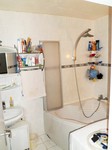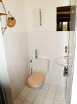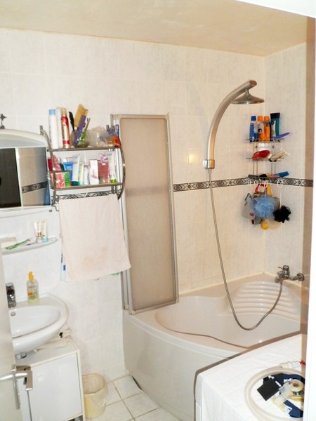 Das Badezimmer ist mit einer Eckbadewanne und einem Waschbecken ausgestattet. Gleich daneben ist ein Extra-WC mit Waschbecken vorzufinden. Die gesamte Wohnung ist mit geschmackvollen Fliesen